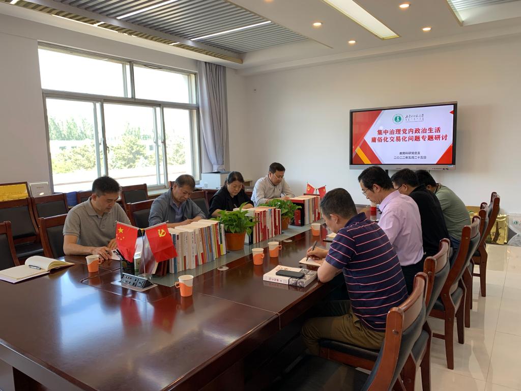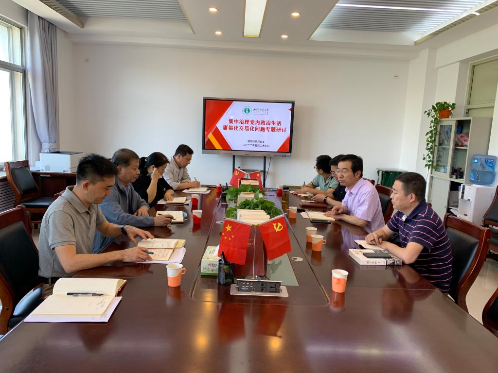 5月25日下午,按照校黨委關(guān)于集中治理黨內(nèi)政治生活庸俗化交易化問題的要求,教務(wù)科研黨總支圍繞學(xué)習(xí)習(xí)近平總書記關(guān)于嚴(yán)肅黨內(nèi)政治生活的重要論述、《關(guān)于新形勢(shì)下黨內(nèi)政治生活的若干準(zhǔn)則》”、集中治理黨內(nèi)政治生活庸俗化交易化問題“十一嚴(yán)禁”開展專題研討交流。教務(wù)科研黨總支書記劉官廳主持會(huì)議,教務(wù)科研黨總支副處級(jí)以上干部參加會(huì)議。