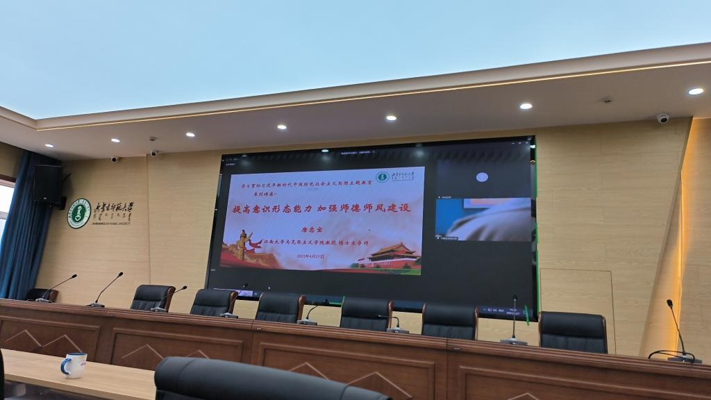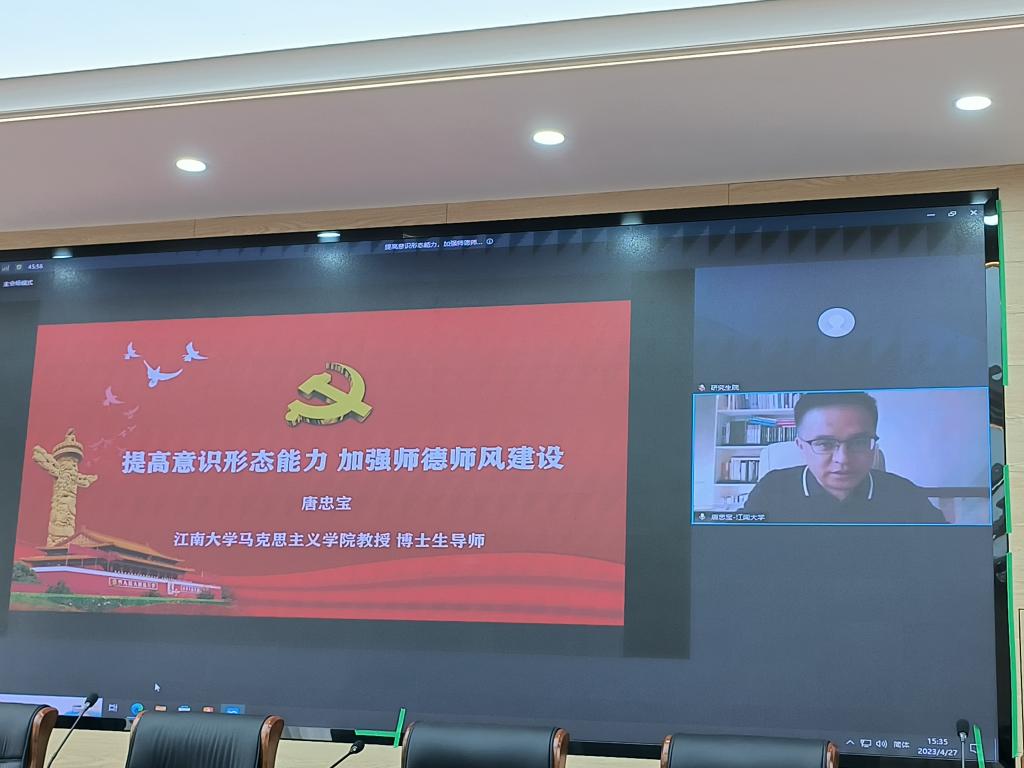 江南大學(xué)馬克思主義學(xué)院教授、博士生導(dǎo)師唐忠寶以《學(xué)習(xí)貫徹習(xí)近平新時(shí)代中國特色社會(huì)主義思想主題教育——提高意識(shí)形態(tài)能力,加強(qiáng)師德師風(fēng)建設(shè)》為題,系統(tǒng)講述了師德師風(fēng)與意識(shí)形態(tài)之間的關(guān)聯(lián)。唐忠寶教授以有生動(dòng)的案例,深入淺出的分析論述了意識(shí)形態(tài)能力對(duì)師德師風(fēng)建設(shè)的重要性。