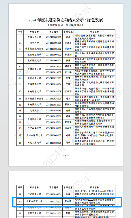 2024年12月,教育部學(xué)位與研究生教育發(fā)展中心聚焦“綠色發(fā)展”“新質(zhì)生產(chǎn)力”“健康中國(guó)”和“數(shù)字中國(guó)”四大主題,開(kāi)展主題案例征集。根據(jù)《關(guān)于開(kāi)展2024年度主題案例征集工作的函》(學(xué)位中心函〔2024〕72號(hào)),我校積極響應(yīng),啟動(dòng)了2024年度教育部學(xué)位與研究生教育發(fā)展中心主題案例的征集工作。經(jīng)過(guò)個(gè)人申報(bào)、學(xué)院初審、研究生院形式審查、專家評(píng)審等程序,最終學(xué)校推薦了《小林的校園欺凌噩夢(mèng)與重生:協(xié)同干預(yù)的力量》等6項(xiàng)優(yōu)秀主題案例。2025年3月,經(jīng)教育部學(xué)位與研究生教育發(fā)展中心案例專家組的評(píng)審,我校王永明教授的案例《“沙坑變形記”——內(nèi)蒙古大青山前坡哈拉更村生態(tài)協(xié)同治理之路》成功立項(xiàng)。